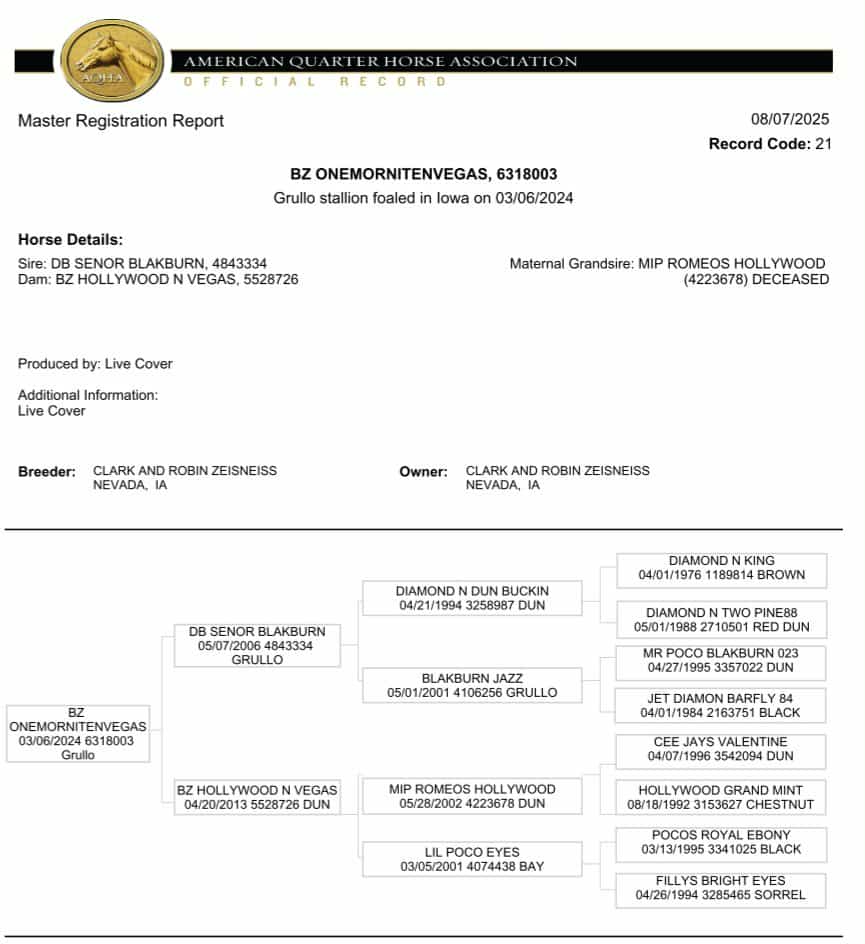 In 2025 Uno earned IBHA Reserve World Champion Yearling Stallion Halter and placed 4th in Dun Factor. He also placed Top 5 at the Ranch Horse Extravaganza Futurity in Yearling Confirmation.